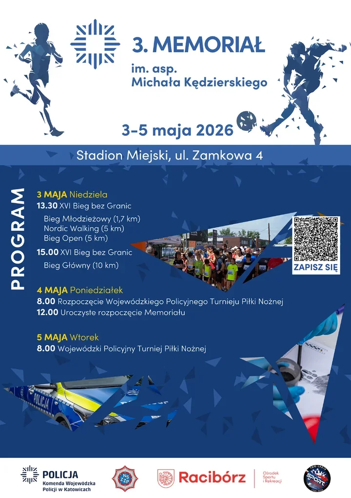 Na stadionie OSiR przy ul. Zamkowej 4 w Raciborzu od 3 do 5 maja 2026 roku odbędzie się III Memoriał im. aspiranta Michała Kędzierskiego. Policja, miasto i OSiR stawiają na sportową rywalizację, ale cała uwaga ma skupić się na pamięci o tragicznie zmarłym funkcjonariuszu. W programie znalazły się biegi oraz Wojewódzki Turniej Policyjny w Piłce Nożnej.