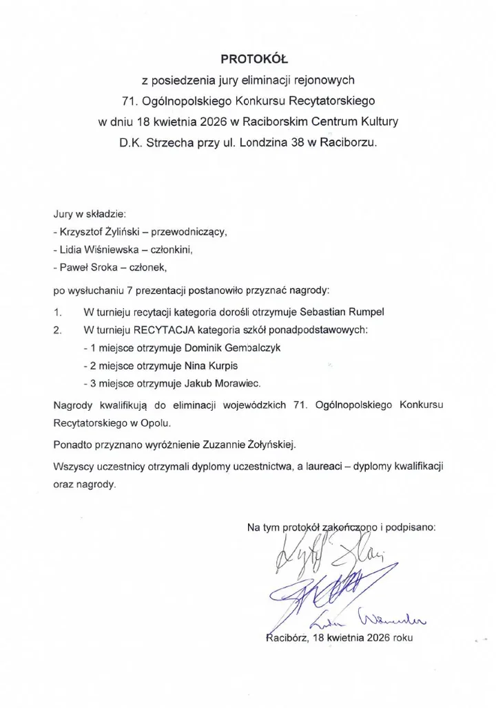Jury wyróżniło też Zuzannę Żołyńską, choć bez awansu do kolejnego etapu. W praktyce oznacza to, że konkurs w Strzesze dał lokalnej scenie kilka mocnych nazwisk i wyłonił tych, którzy pojadą z Raciborza i okolic dalej, do kolejnego odsłony recytatorskich zmagań.