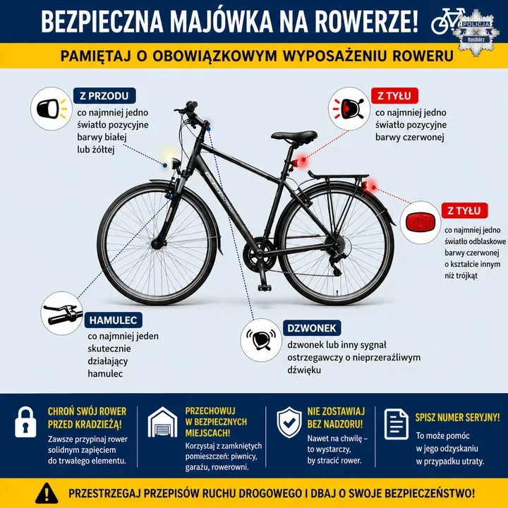 Na drogach i ścieżkach zrobi się tłoczniej, a policjanci już teraz przypominają o sprawdzeniu roweru przed wyjazdem. Funkcjonariusze zwracają uwagę na hamulce, oświetlenie, opony i sygnał dźwiękowy. Równie ważne jest przypięcie jednośladu, bo majówka to czas, gdy kradzieże rowerów zdarzają się częściej.