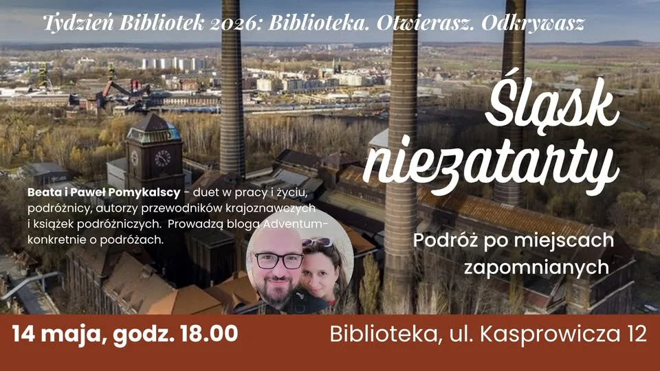 To będzie wieczór dla tych, którzy lubią historie z duszą, trochę nostalgii i miejsca, które nie mieszczą się w prostych przewodnikach Beata i Paweł Pomykalscy zabiorą uczestników w podróż po Śląsku takim, jakiego już prawie nie widać: po pałacach, zamkach, dawnych halach przemysłowych i miasteczkach, które powoli znikają z codziennej pamięci. Warto zarezerwować sobie ten termin — zapowiada się spotkanie, po którym trudno patrzeć na region tak samo.