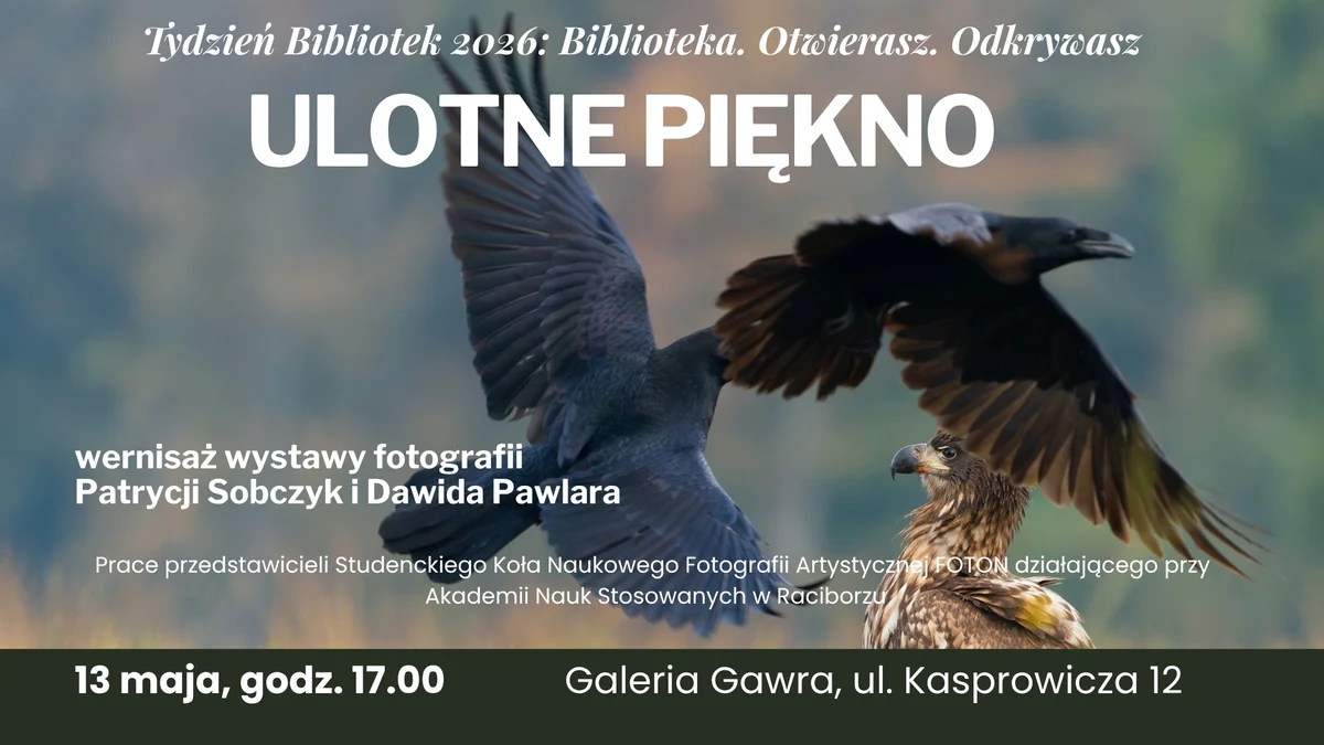 W Raciborzu szykuje się wieczór dla tych, którzy lubią patrzeć na świat trochę uważniej W ramach Tygodnia Bibliotek odbędzie się wernisaż wystawy „Ulotne piękno” – z fotografiami Patrycji Sobczyk i Dawida Pawlara, czyli młodych autorów związanych z FOTON-em. To dobra okazja, żeby zobaczyć przyrodę uchwyconą w bardzo świeży, wrażliwy sposób i zajrzeć do świata, w którym liczy się światło, detal i odpowiedni moment. Warto wpaść i zobaczyć to na własne oczy.